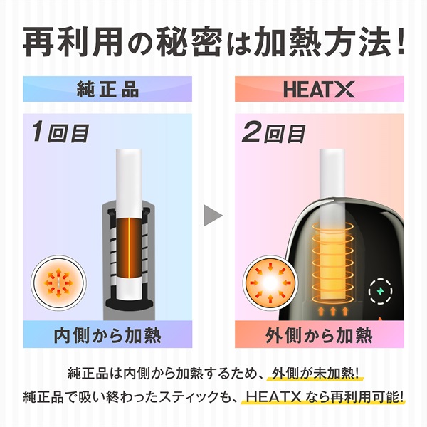 「1本で2回吸える!」 コスパ・味わい・高品質の三拍子そろった ※当社調べ 次世代アイコスイルマ互換機【HEATX(ヒートエックス)】登場!