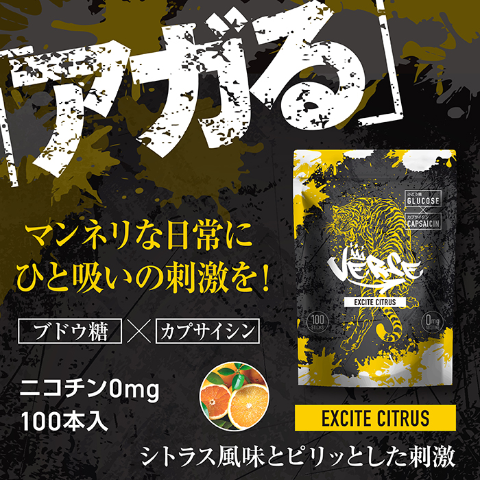 ■EXCITE CITRUS(エキサイトシトラス) ・甘く弾けるシトラスにピリッと刺激。 ・ブドウ糖 × カプサイシン マンネリな日常に“ひと吸いの刺激を!”。
